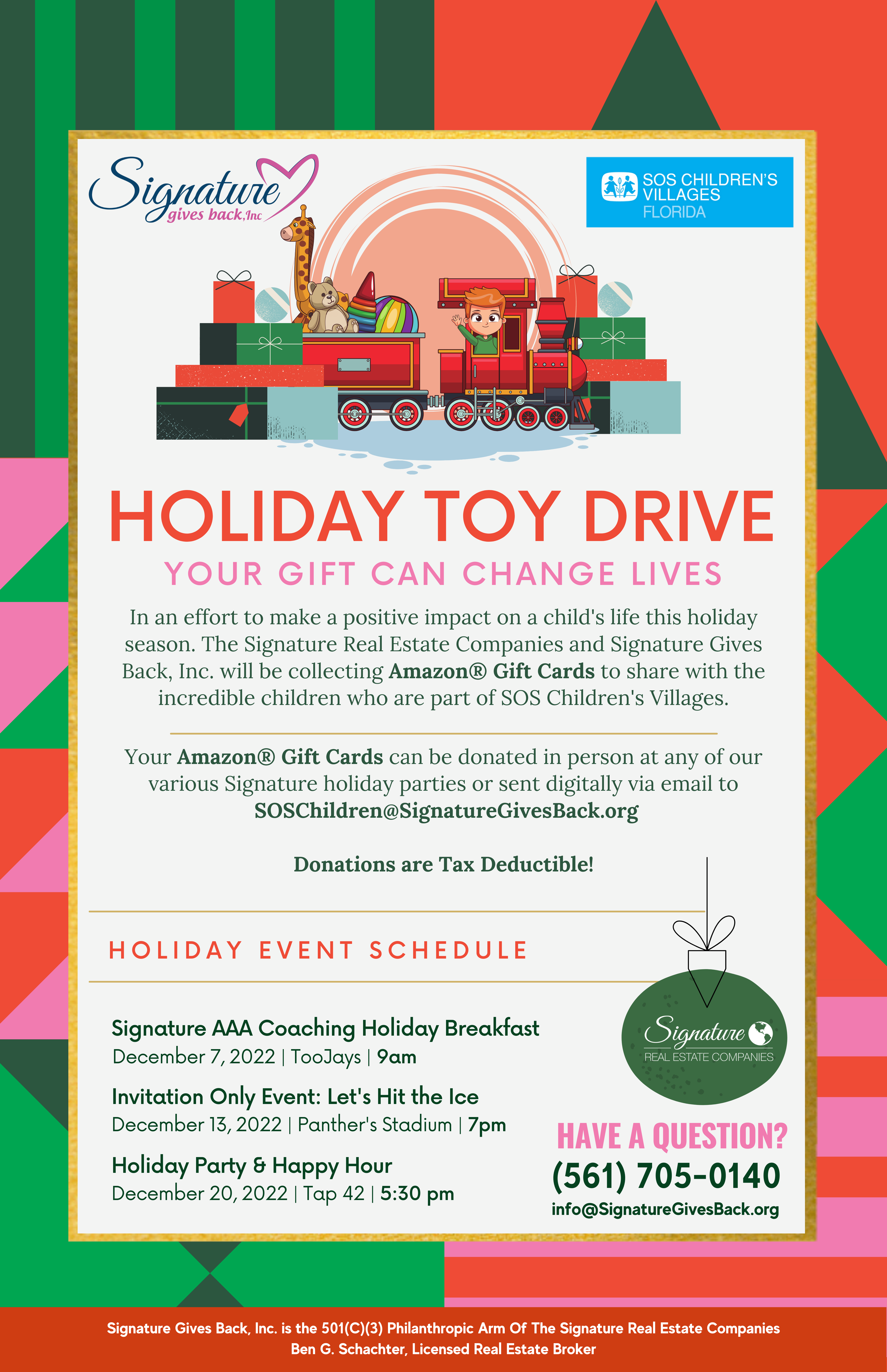 Your gift can change lives. In an effort to make a positive impact on a child's life this season, The Signature Real Estate Companies and Signature Gives Back, Inc. will be collecting Amazon Gift Cards to share with the incredible children who are part of SOS Children's Villages.
