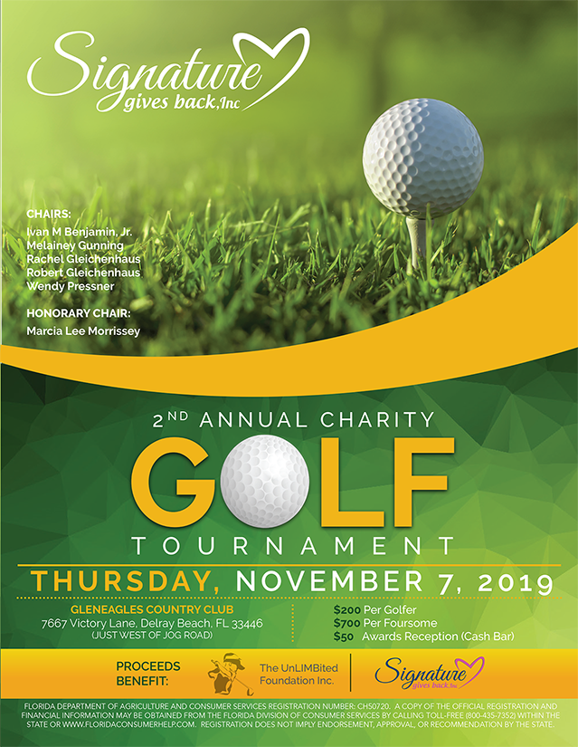 Welcome to the Signature Gives Back 2019 2nd Annual Charity Golf Tournament. This year’s exciting event will once again feature the talents of one-arm, 8-year-old golf prodigy, Tommy Morrissey, who has appeared on The Ellen DeGeneres Show, Little Big Shots with Steve Harvey, and HBO’s Real Sports with Bryant Gumbel. Proceeds from this event will benefit BOTH the Morrissey family’s The UnLIMBited Foundation, Inc. and Signature Gives Back, Inc.