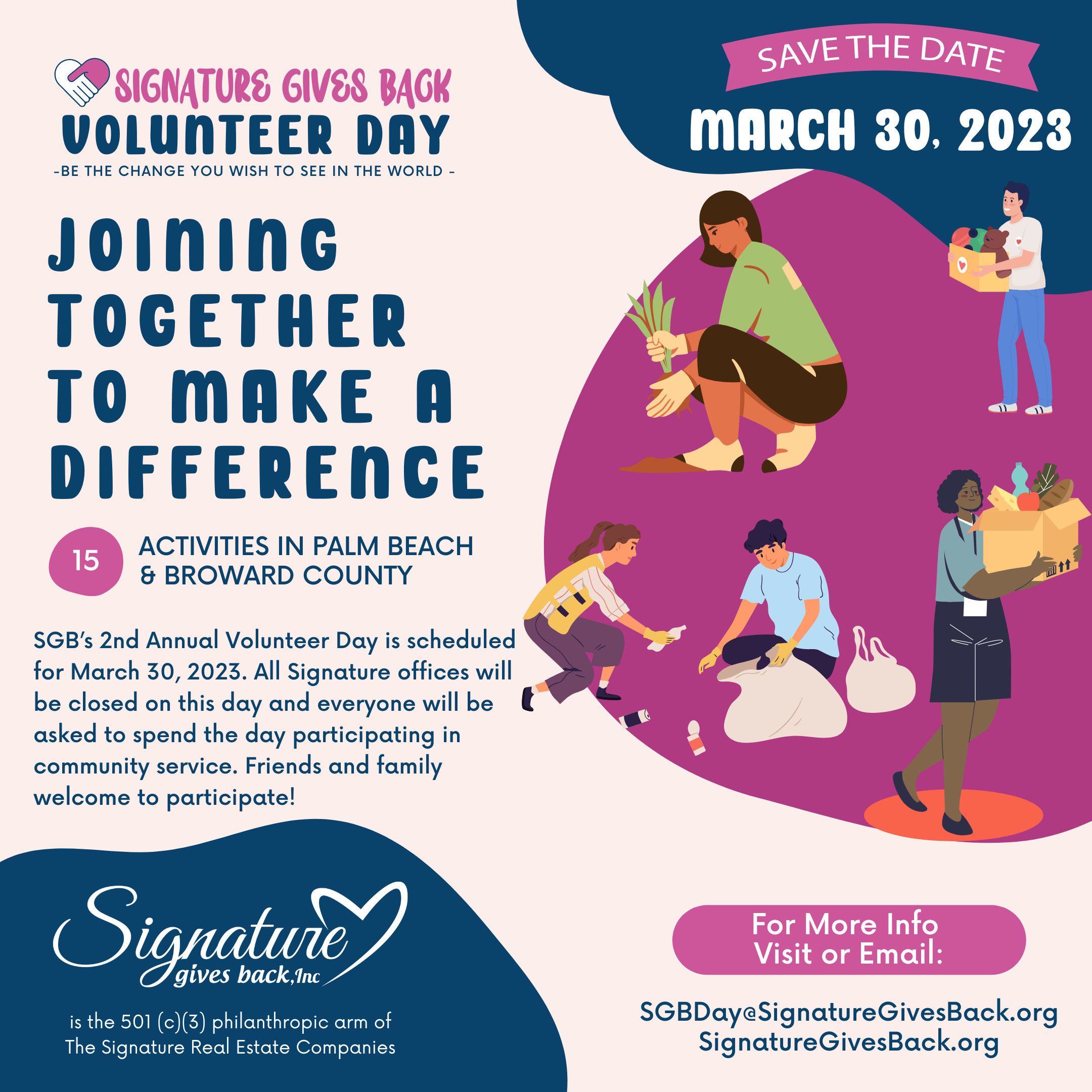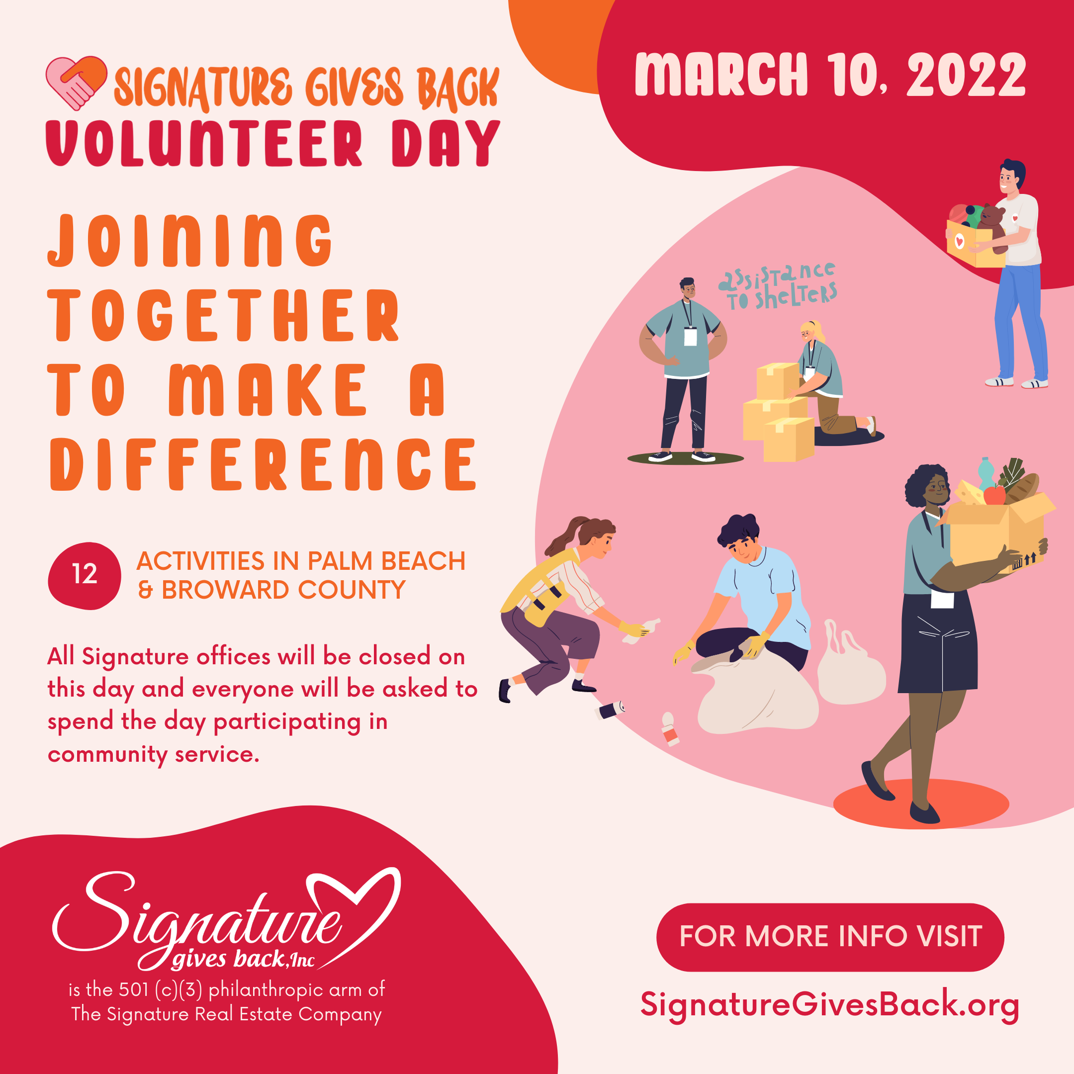 On March 10, 2022 The Signature Real Estate Companies will be closing all offices to provide a great opportunity for our team members to give back to communities across South Florida for The Signature Gives Back Volunteer Day.