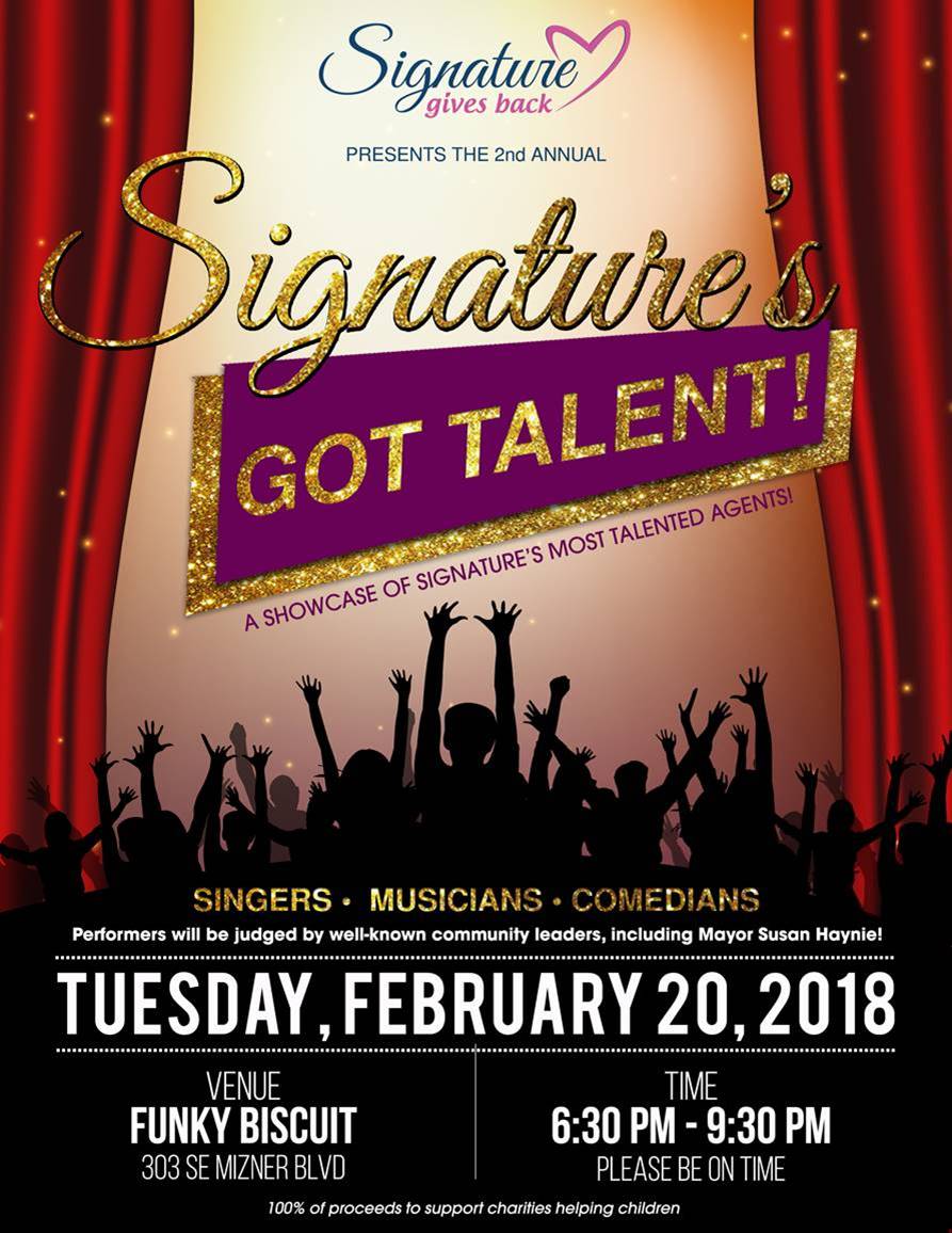 Signature Gives Back, Inc. (SGB), the charitable arm of The Signature Real Estate Companies (SREC), hosted its Second Annual Signature’s Got Talent Show at The Funky Biscuit, Tuesday, Feb. 20, 2018.