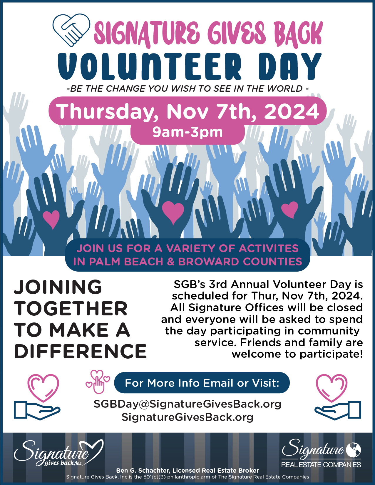 Signature Gives Back, Inc (SGB), the philanthropic arm of The Signature Real Estate Companies (Signature), is organizing its 3 rd Annual SGB Volunteer Day for November 7, 2024, an exciting day of Giving Back to the communities Signature real estate professionals serve.