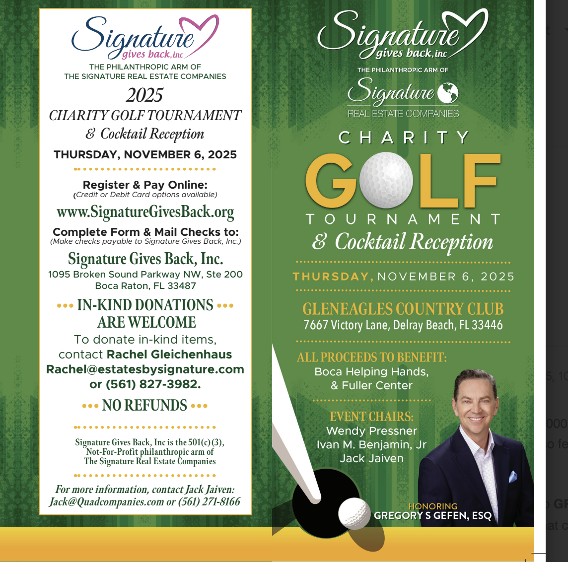 Join Signature Gives Back for a fun day of golf benefiting 2 remarkable local charities - Boca Helping Hands and Fuller Center. Honoring Gregory S. Gefen, Esq.