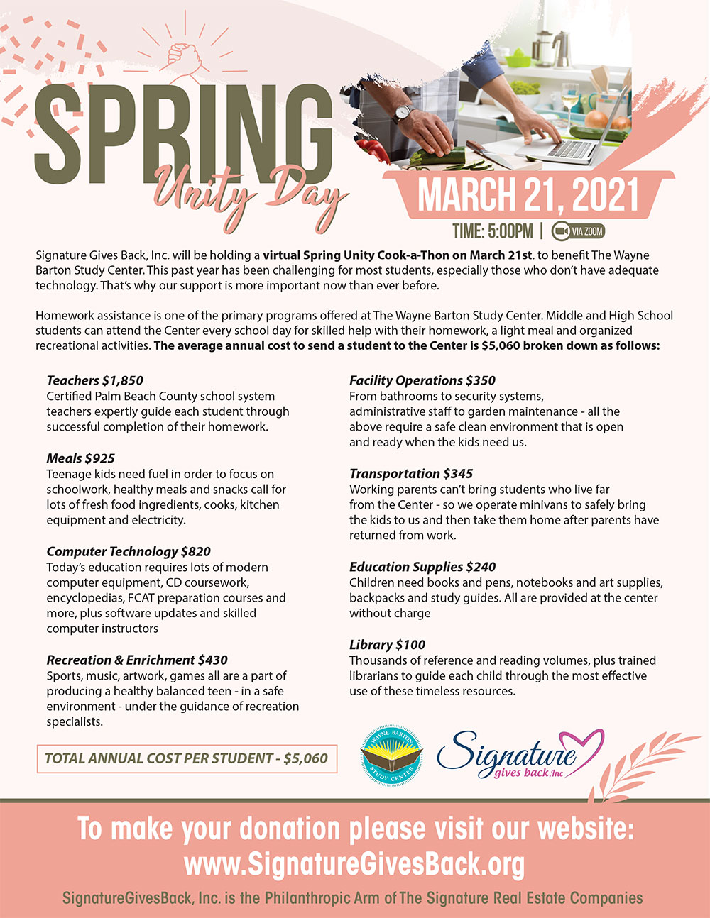 Signature Gives Back, Inc. will be holding a virtual Spring Unity Cook-a-Thon on March 21st. to benefit The Wayne Barton Study Center. This past year has been challenging for most students, especially those who don’t have adequate technology. That’s why our support is more important now than ever before.