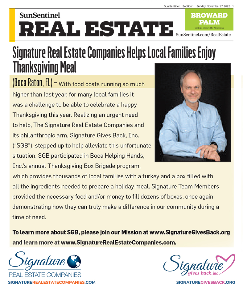 With food costs running so much higher than last year, for many local families it was a challenge to be able to celebrate a happy Thanksgiving this year. Realizing an urgent need to help, The Signature Real Estate Companies and its philanthropic arm, Signature Gives Back, Inc. ("SGB"), stepped up to help alleviate this unfortunate situation.