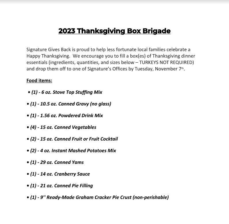 Signature Gives Back is proud to help less fortunate local families celebrate a Happy Thanksgiving.